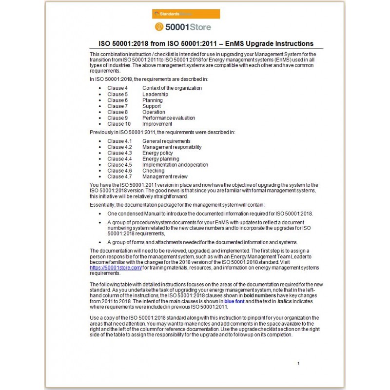 This instruction / checklist is intended for use in upgrading your Energy Management System for the transition from ISO 50001:2011 to ISO 50001:2018 for energy management systems (EnMS) used in all types of industries. With our fully customizable Energy Manual and Procedures Package, you will have all the processes and documents you need to build your EnMS for a successful ISO 50001:2018 Registration.